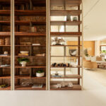 No projeto, a estante da Artefacto foi desenhada especialmente para o espaço: ela começa apoiada na parede de pedra e se transforma em um biombo vazado na ponta da escada. Próximo ao hall de entrada, a estrutura metálica revestida de couro e prateleiras em pau-ferro, com impressionantes 3 metros de altura, foi praticamente um trabalho de engenharia.