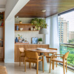 Neste apartamento com ambientes integrados, a ideia era promover uma configuração fluida entre os espaços, valorizando os momentos de convivência. Com uma mesa de jantar e um móvel de apoio com bar, a varanda ganha protagonismo para reunir a família e amigos, tornando-se o lugar preferido da casa para curtir o clima fresco da primavera.