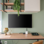 Com um recorte de parede pintado em verde, este projeto cria uma moldura visual para a área de trabalho. A paleta neutra da mesa e da cadeira contrasta com a vibração da cor, enquanto as prateleiras brancas e os quadros botânicos reforçam a proposta de integrar o espaço à natureza. Um home office compacto, mas cheio de estilo.