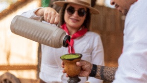 O mix da camisa rosa pastel com a calça amarela fluida cria um look arejado, perfeito para dias quentes. O contraste fica por conta dos acessórios modernos, como os óculos escuros e os sapatos trançados brancos.