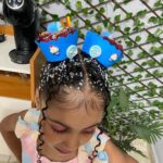 Aqui, a criatividade é o limite: os fios são presos em pequenos coques e enfeitados com hastes de chenile coloridas, que criam um visual cheio de movimento. As fitas e brilhos completam o look, destacando o volume natural dos cachos e deixando tudo ainda mais divertido.